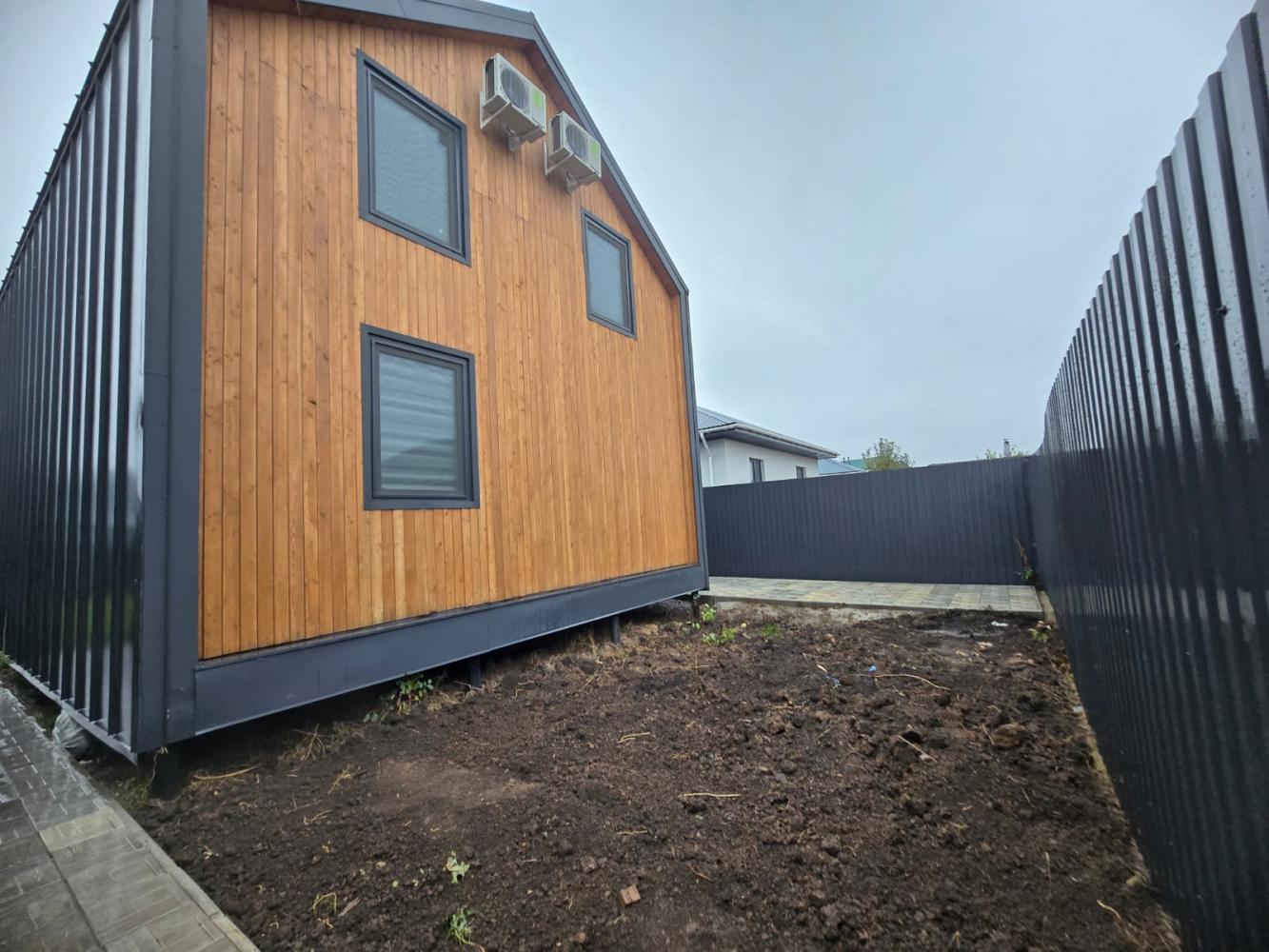 🔸 Ограждение: Высокий (2 м) забор из профнастила серого цвета, обеспечивающий полную приватность. Есть калитка.