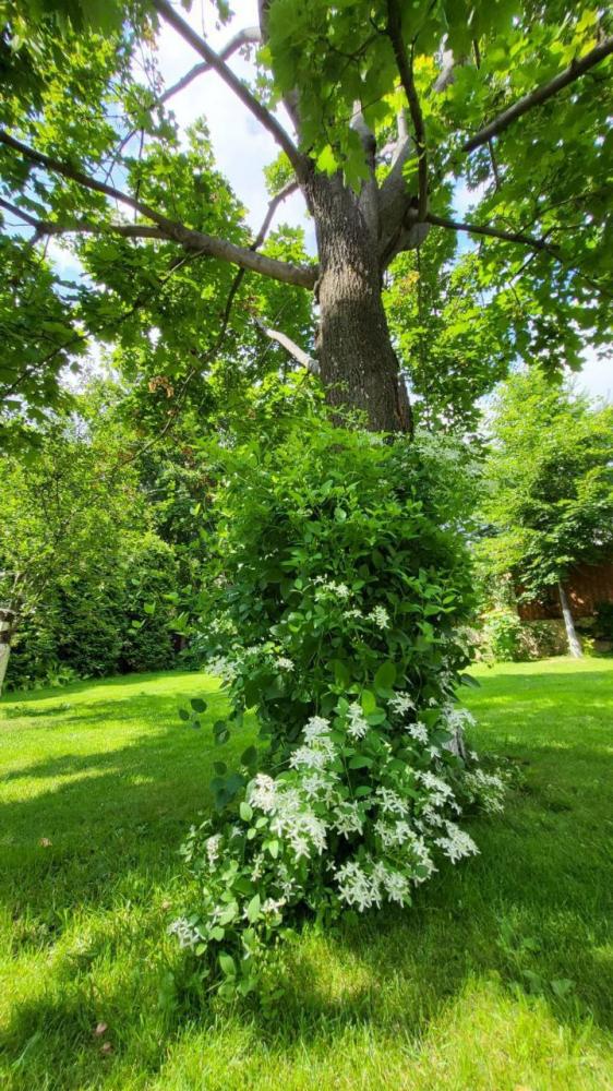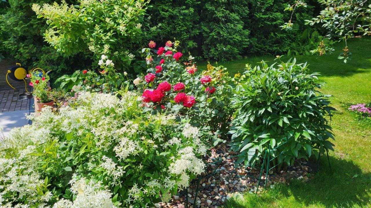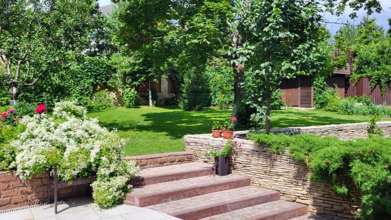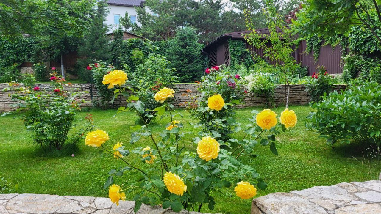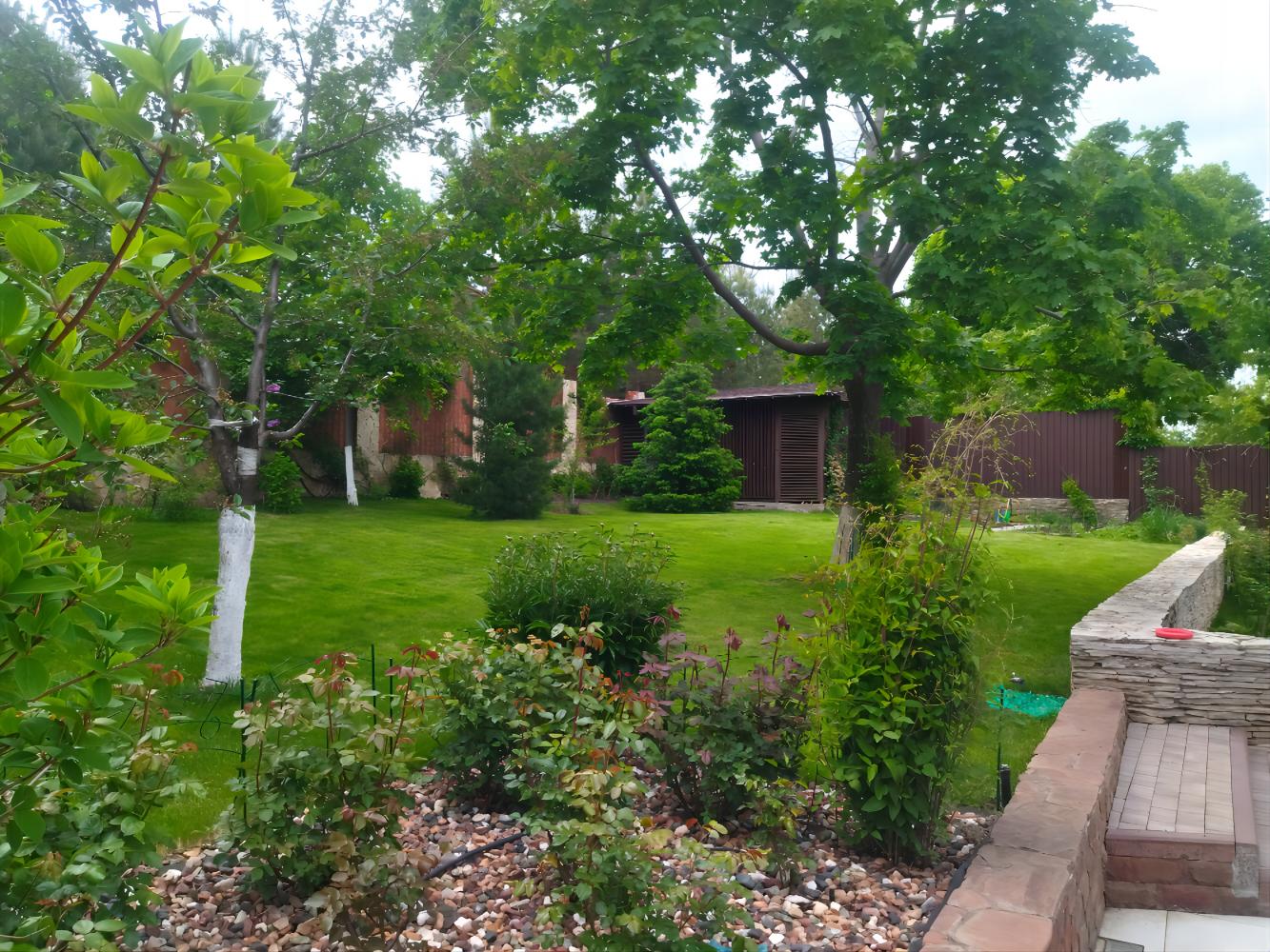 На ухоженном участке высажены ели, берёзы, туи, вишня, яблони, абрикос, 20 кустов роз...