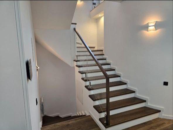 Цокольный этаж - спортзал, совмещенный санузел, две кладовые, два коридора, новая современная дубовая лестница, теплый гараж на два автомобиля.