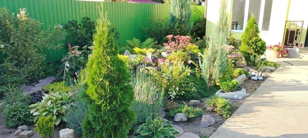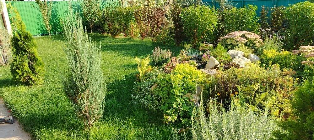 Растут декоративные растения, молодые плодовые деревья и кустарники.