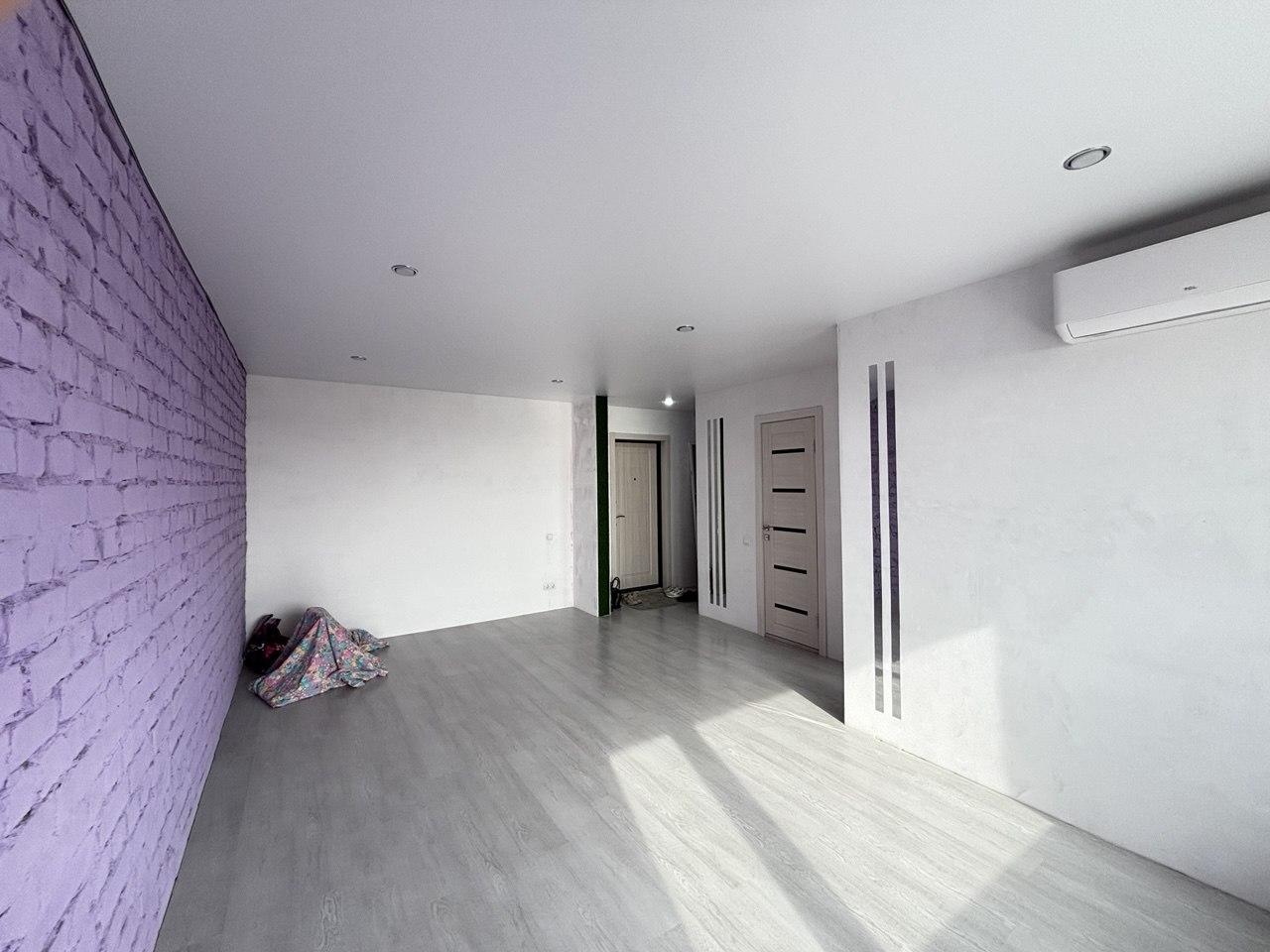 В комнате натяжные потолки, ламинат, установлен кондиционер.