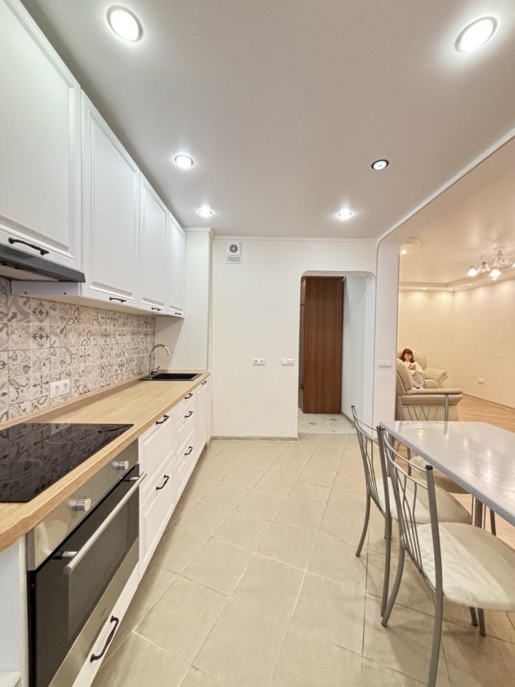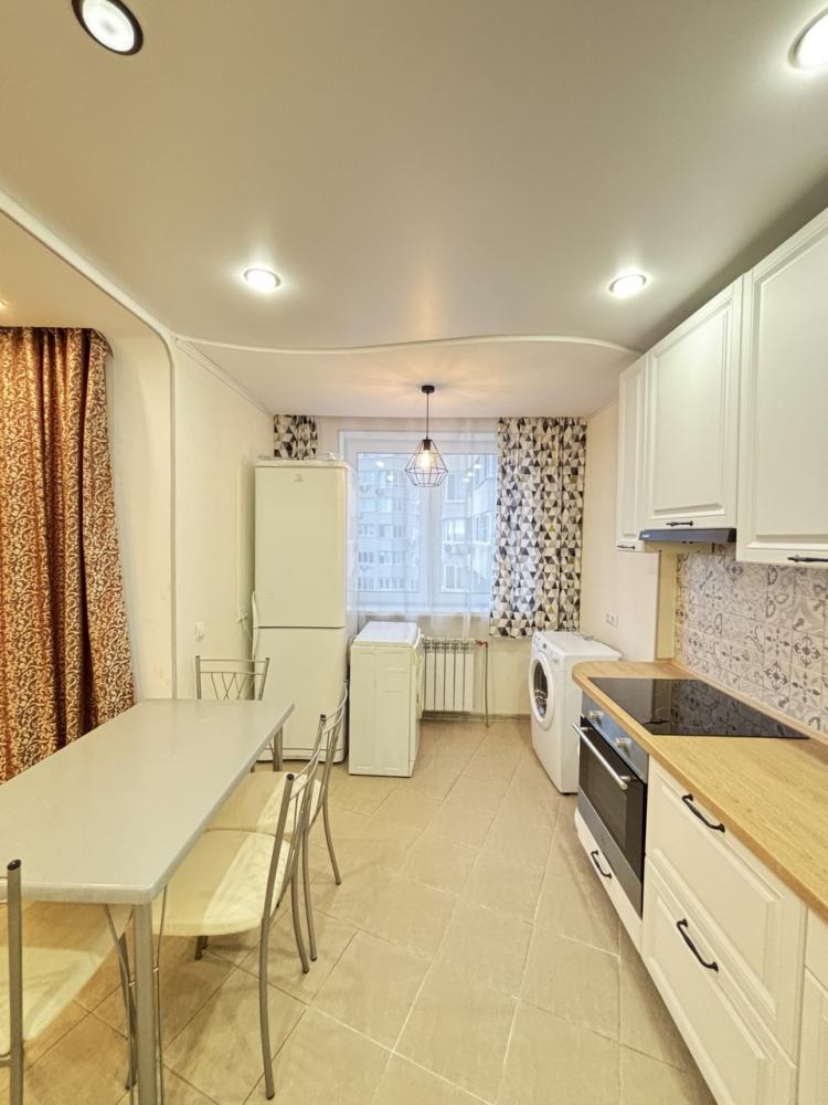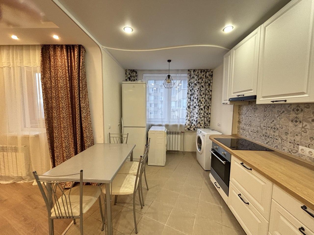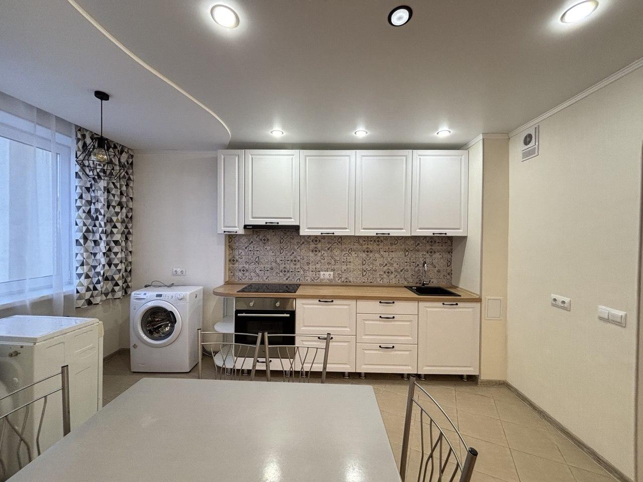 Кухня полностью оборудована встроенной мебелью и бытовой техникой (вытяжка, электрическая варочная панель, электрический духовой шкаф, холодильник, стиральная машина), которая остаётся новому владельцу.