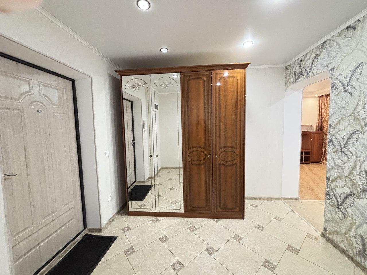 Прихожая оборудована шкафом с зеркальными фасадами.