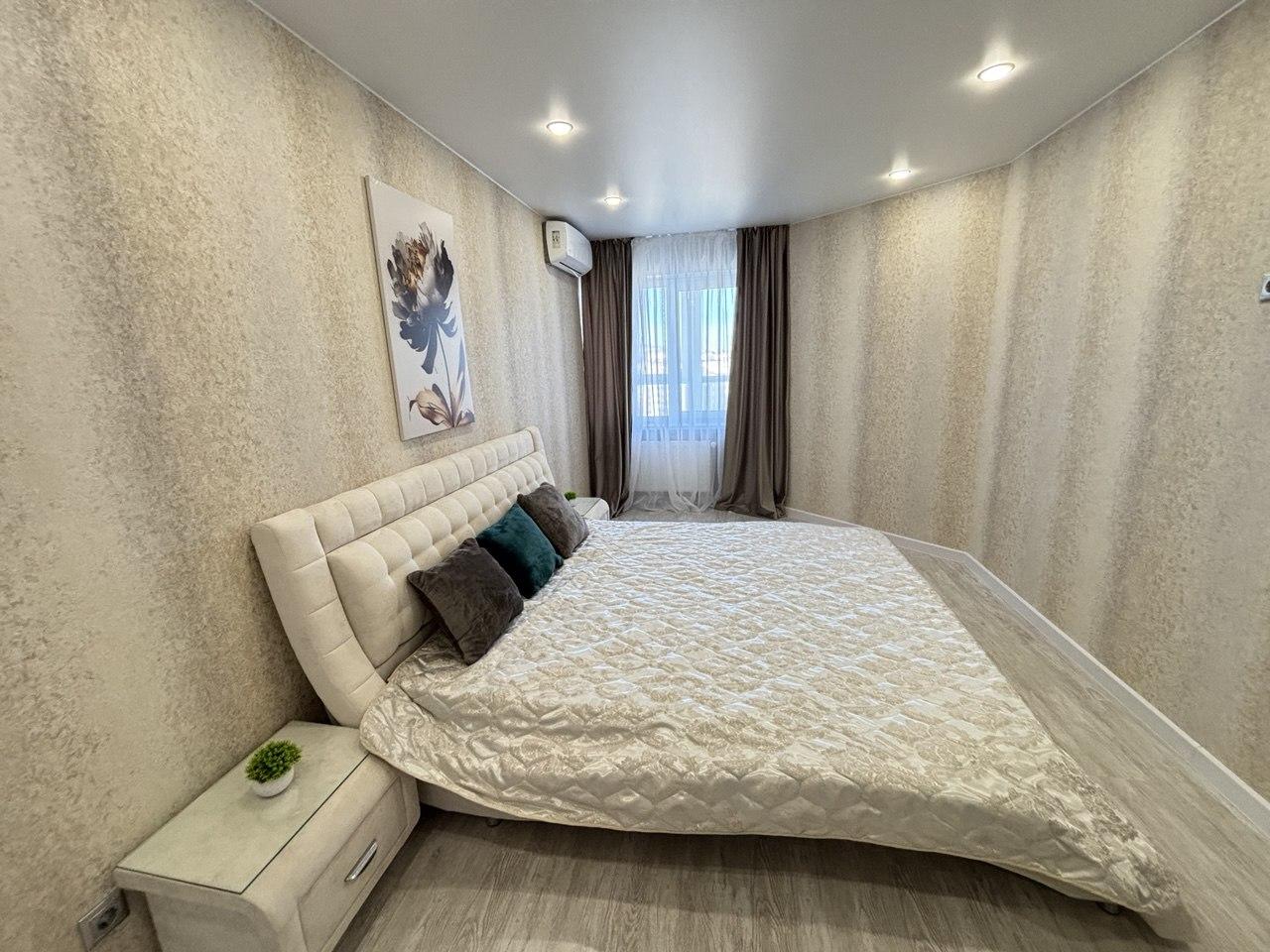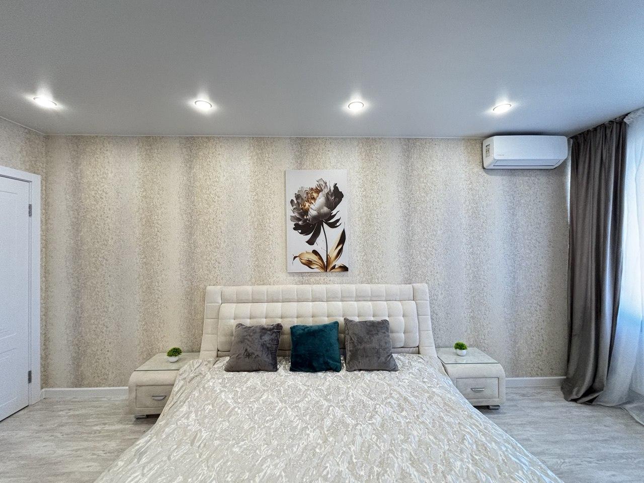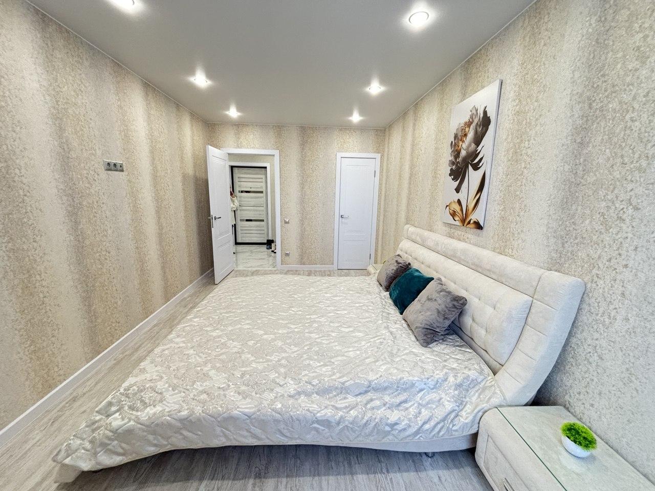 В спальне новая двуспальная кровать с ортопедическим матрасом, есть вместительная гардеробная.