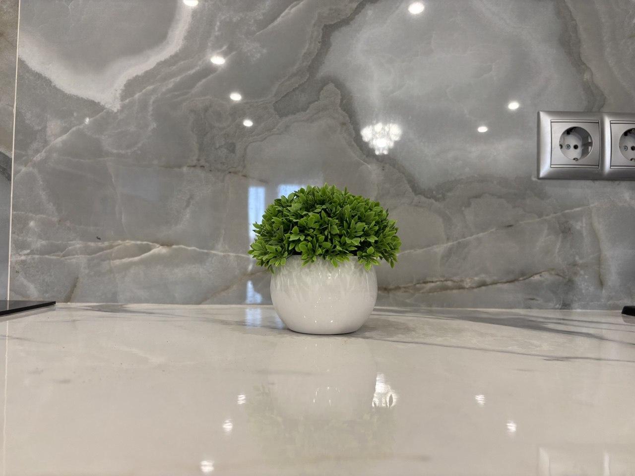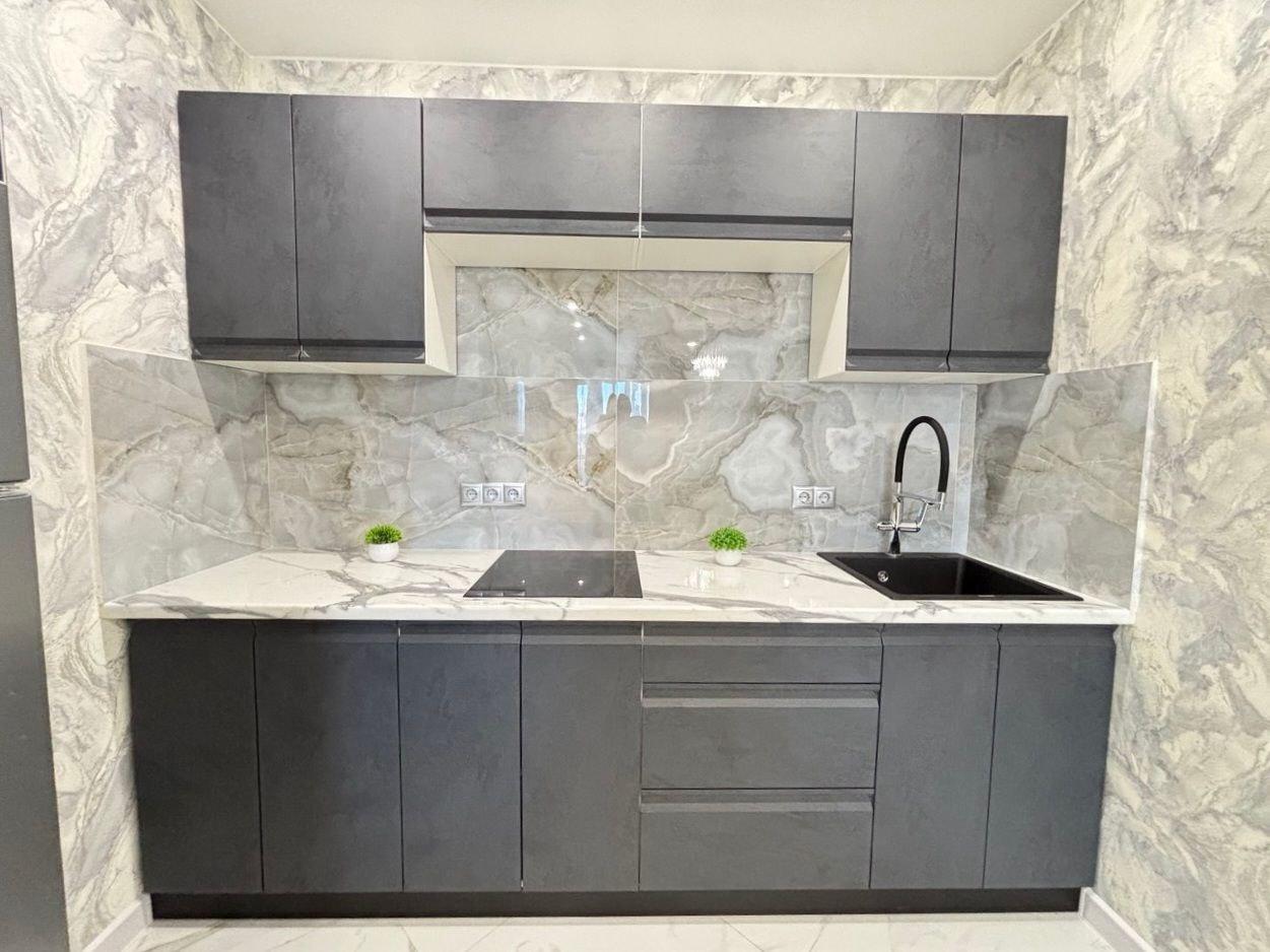 Кухня-гостиная оборудована встроенной мебелью и бытовой техникой (электрическая варочная панель, электрический духовой шкаф, холодильник, кондиционер), которая остаётся новому владельцу.