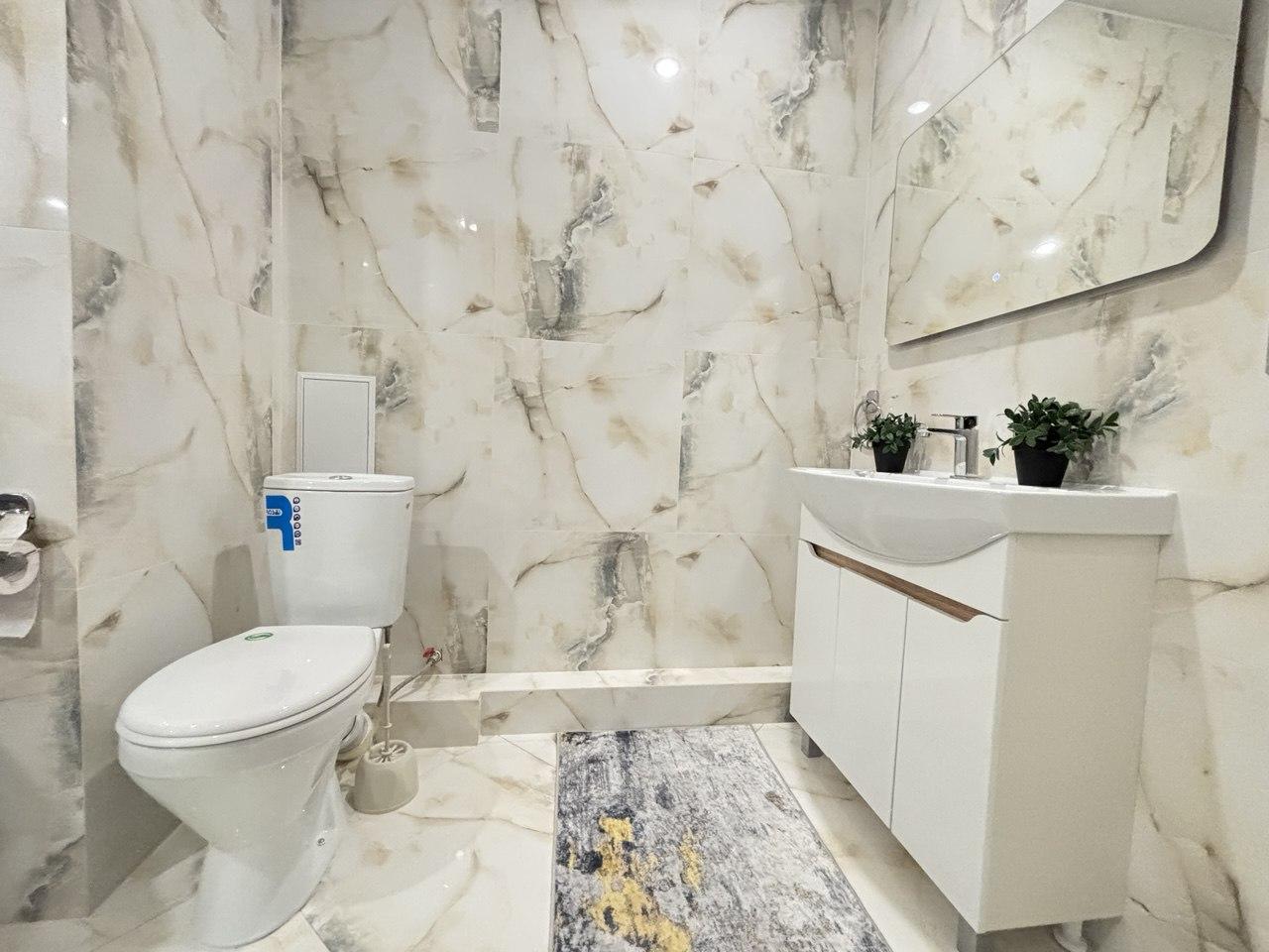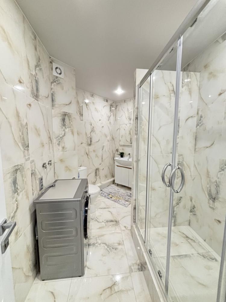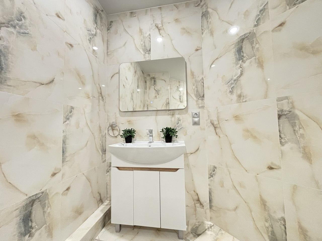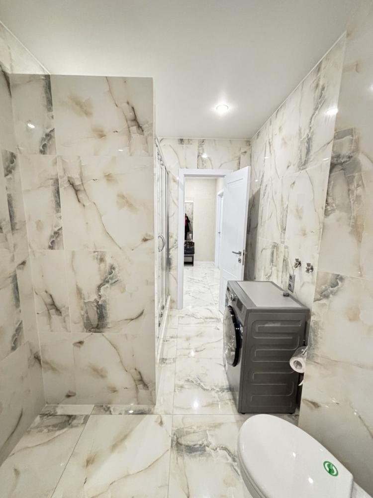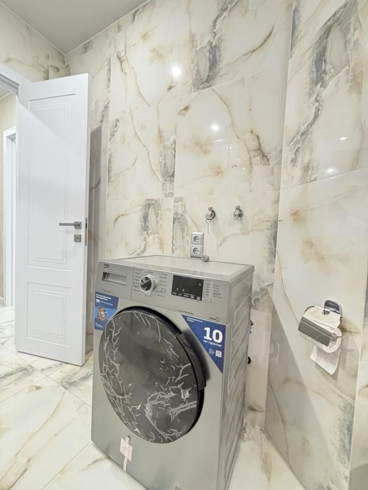 Санузел выложен современным кафелем, оборудован импортной сантехникой, стиральной машиной, душевая зона выложена плиткой.