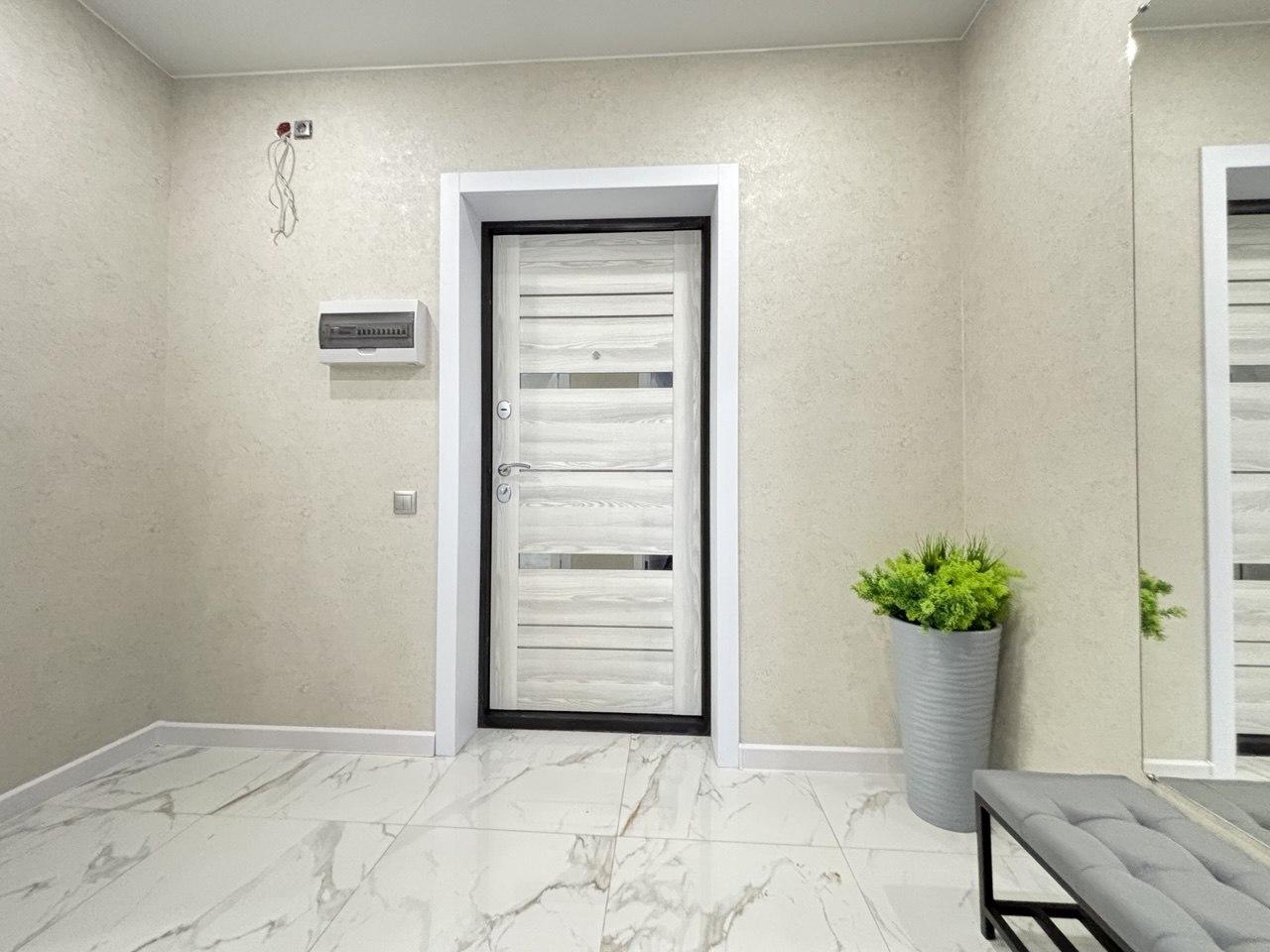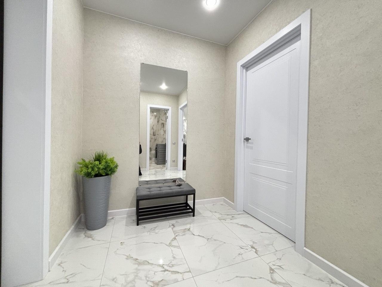 В квартире выполнен дизайнерский ремонт с применением современных строительных материалов, оптимальная система отопления (разводка труб в полу), электрическая проводка (установлен распределительный щит с автоматами в квартире, на каждый электроприбор отдельный автомат), напольное покрытие - керамогранит, потолки натяжные, окна пластиковые, входная металлическая дверь фирмы ТОРЭКС.
