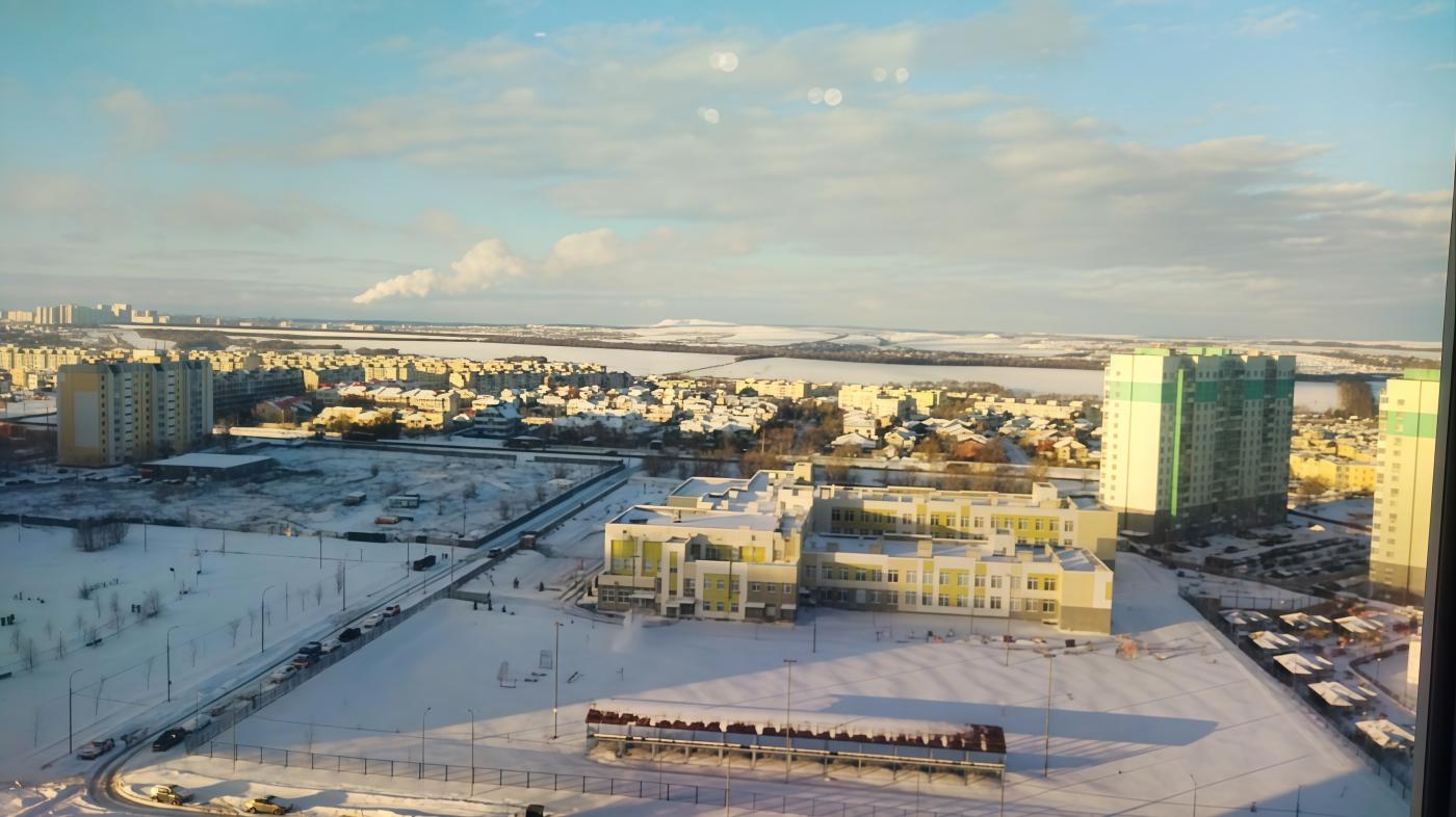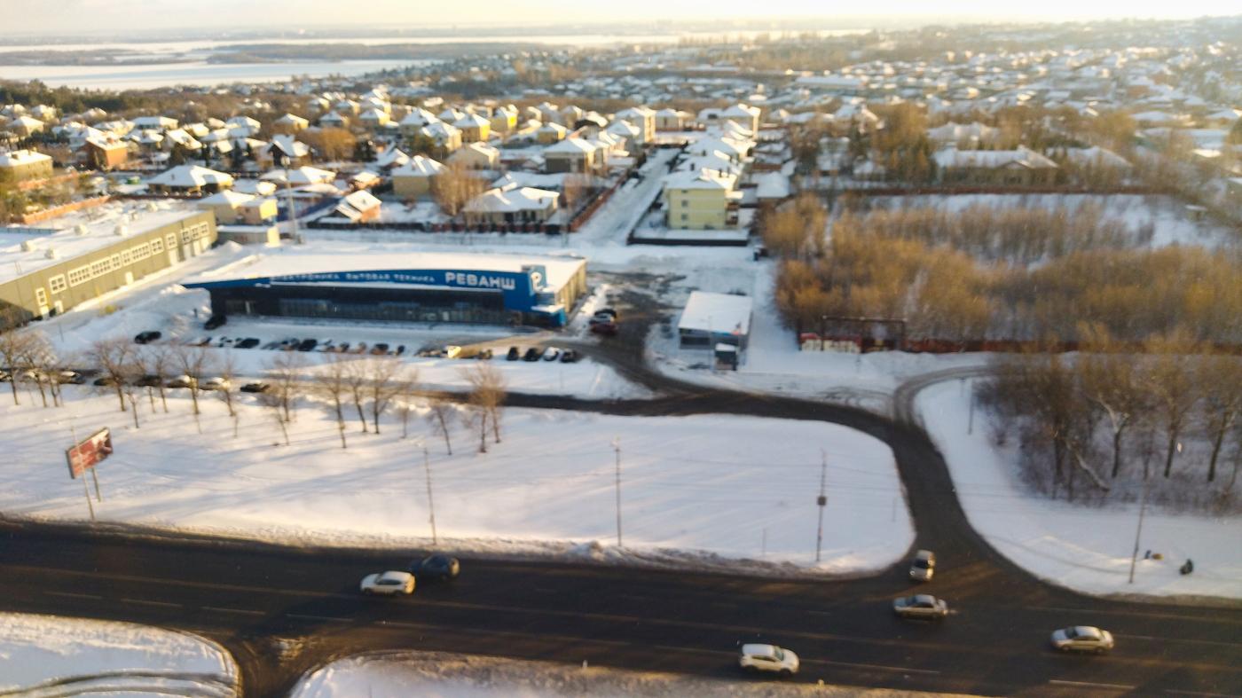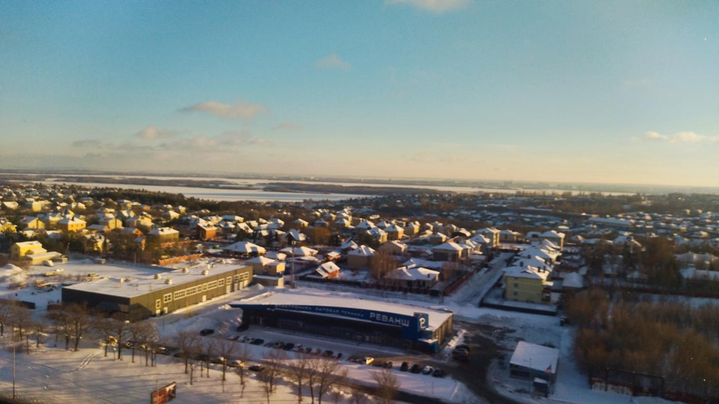 Вид во двор (на живописные поля и коттеджный посёлок) и на улицу (на шоссе, магазин Реванш и на Волгу) с высоты птичьего полета. Квартира не угловая, очень теплая.