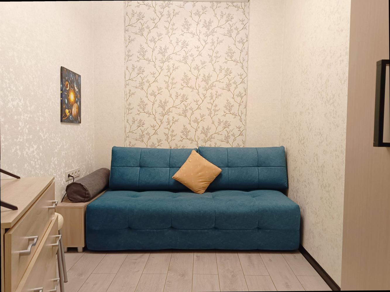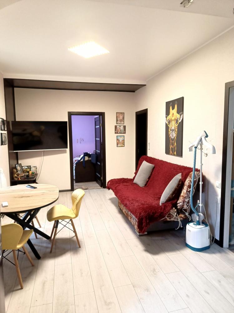Общая площадь квартиры 46 кв.м.. В квартире произведен евро ремонт. Просторная зона отдыха за счет объединения кухни и комнаты.